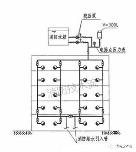 高位消防水箱的主要作用是供給建筑初期火災(zāi)時(shí)的消防用水水量,當(dāng)消防水滅火系統(tǒng)例如室內(nèi)消火栓系統(tǒng)的穩(wěn)壓裝置設(shè)置在高位時(shí),因高位消防水箱經(jīng)過(guò)穩(wěn)壓裝置與消防管網(wǎng)連接,容易漏設(shè)高位水箱的并聯(lián)重力出水管(如下圖)。